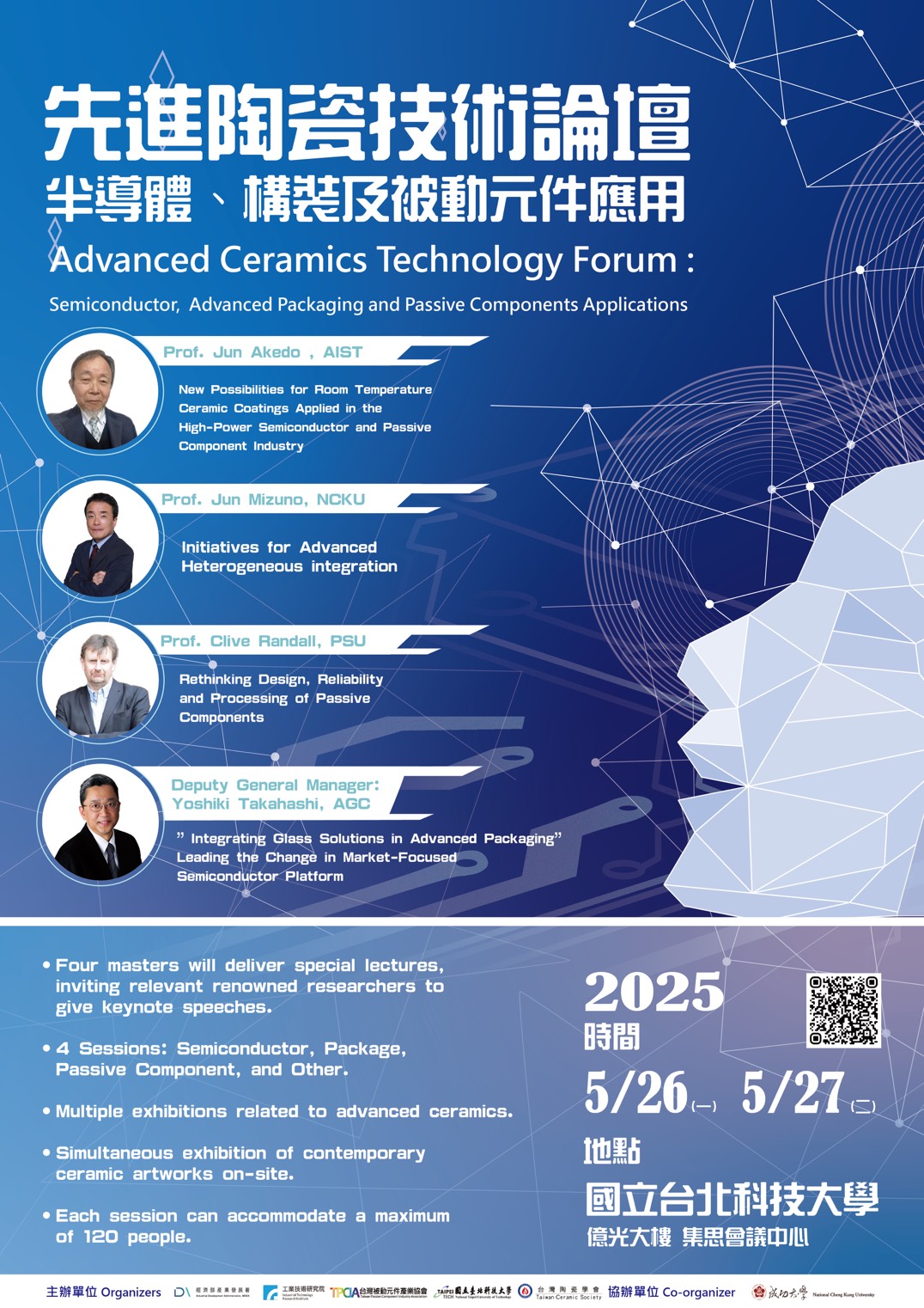 This forum, titled “Advanced Ceramics Materials Technology Forum – Semiconductors, Packaging, and Passive Components,” is jointly organized by the Industrial Technology Research Institute (ITRI), National Taipei University of Technology (NTUT), the Taiwan Ceramic Society (TCERS), and the Taiwan Passive Components Industry Association (TPCIA). Through this forum, domestic and international researchers in the field of ceramic science are invited to conduct in-depth analysis, research, and discussion on key issues related to advanced semiconductor technologies.