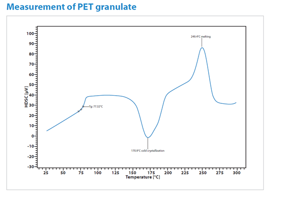 Chip-based DSC offers high sensitivity and excellent resolution for polymer applications, making it ideal for studying glass transition, crystallization behavior, and melting behavior. In this example, PET pellets were quenched to form an amorphous structure and then heated at 50 K/min. The DSC curve shows the following features: