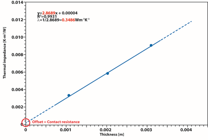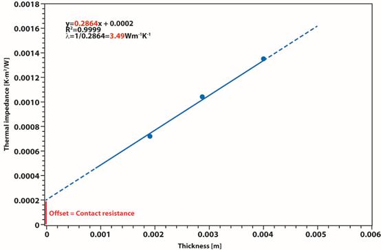 Linear regression using three different sample thicknesses (1.1–3.08 mm) was applied to determine the contact thermal resistance and thermal conductivity.
