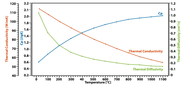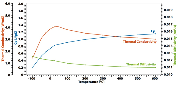 Results show that specific heat slightly increases with temperature, while thermal diffusivity and thermal conductivity gradually decrease.