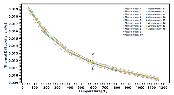 A glass-ceramic material (Pyroceram) was used as a high-temperature reference material, and multi-point thermal diffusivity measurements were performed using the LFA 1000. Multiple specimens cut from different positions of the same plate were tested. Eight independent measurements were performed within the temperature range up to 1250°C, and the results showed that the deviation in thermal diffusivity remained within ±1%, demonstrating excellent repeatability and stability of the system.