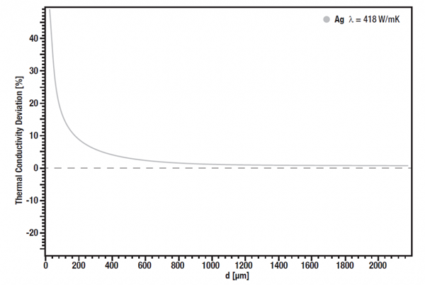 A standard silver sample was used to study the influence of sample thickness on thermal conductivity accuracy. At room temperature, standard silver specimens with different thicknesses were measured. Thermal conductivity was calculated from α, ρ, and cp, and compared with literature values. Results indicate that as the sample thickness decreases, the deviation of thermal conductivity continues to improve and reaches an optimal region around 200 µm. For even thinner samples, it is necessary to consider that thin films may behave differently from bulk materials. In this case, thin-film-specific thermal conductivity measurement techniques are recommended.