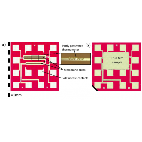 Once deposition is completed, thermal conductivity, electrical conductivity, and thermoelectric parameters can be fully characterized on the same platform.