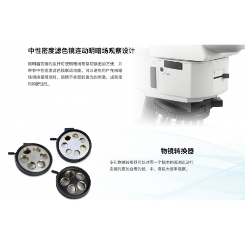 - Linked Brightfield/Darkfield Switching: Neutral density filters are synchronized with the switching lever to reduce sudden light intensity when changing from darkfield to brightfield, improving user safety and visual comfort.